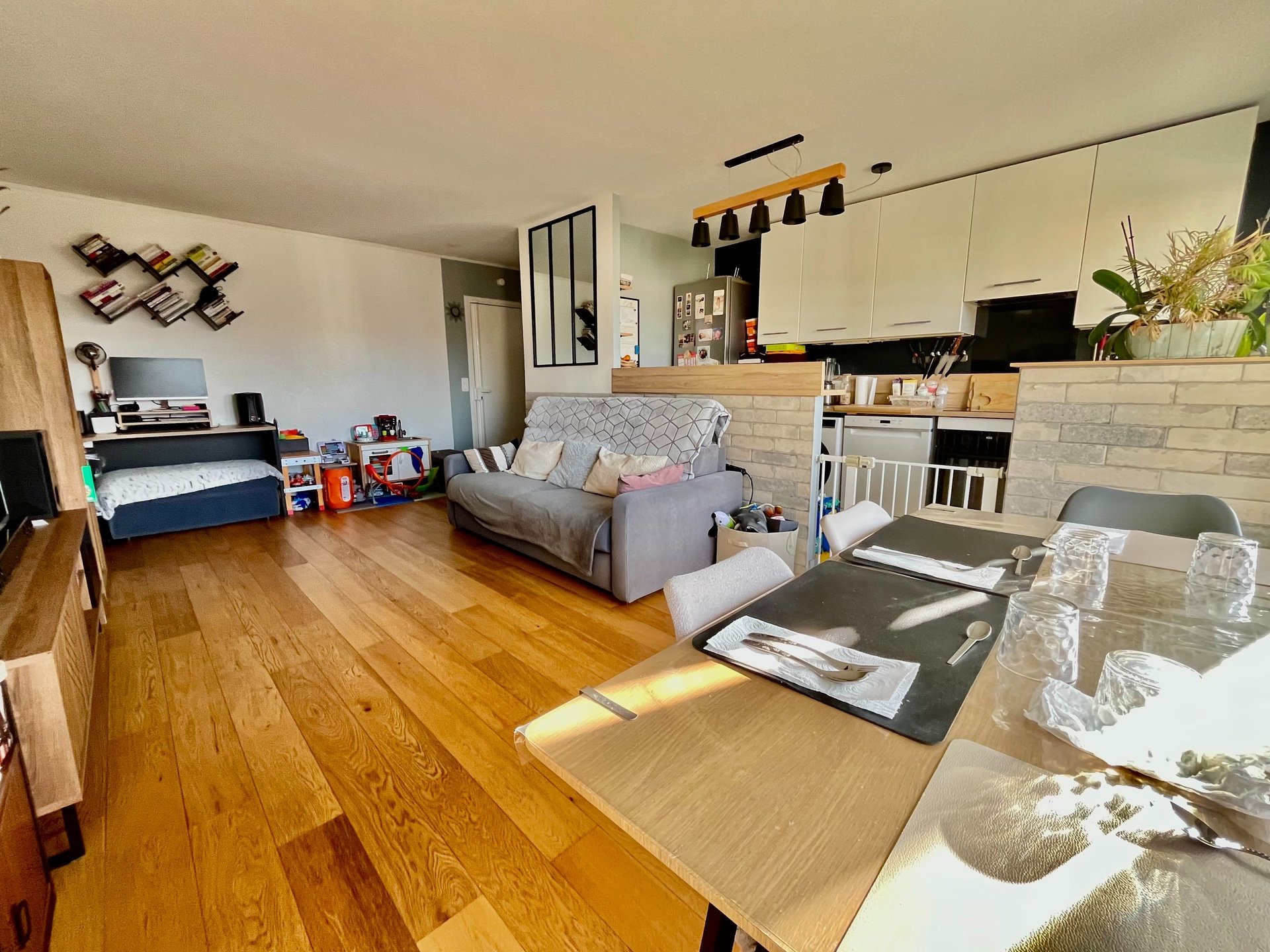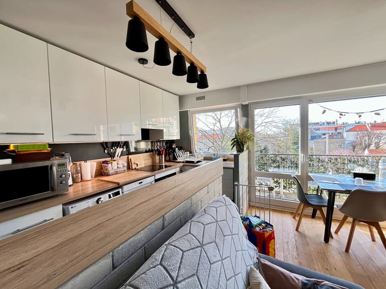La cuisine ouverte, aménagée et entièrement équipée, s'intègre parfaitement à l'espace salle à manger ainsi qu'à l'ensemble de l'appartement.